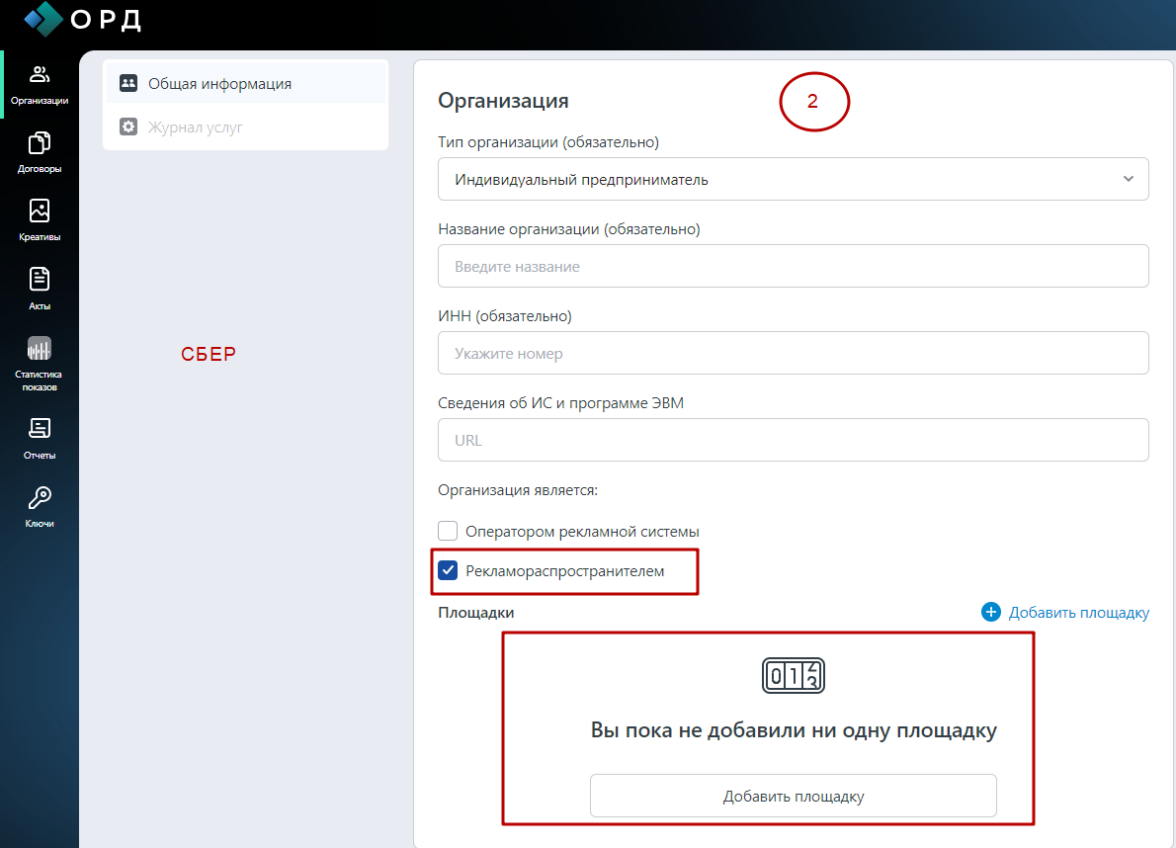 В Сбер ОРД вообще нет блока Площадки и площадку можно прикрепить ТОЛЬКО, если будет иметь место заведение Контрагента и простановки у него галочки РР (слайд 2).