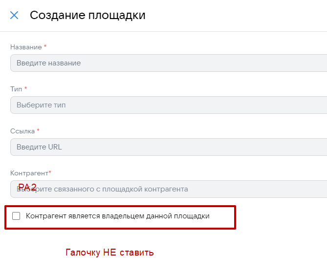 А для остальных ОРД РА (вы) должно будет при занесении площадок в своем ОРД указывать в качестве Организации (Контрагента) рекламное агентство РА2 и НЕ ставить галочку, что площадка принадлежит РА2.