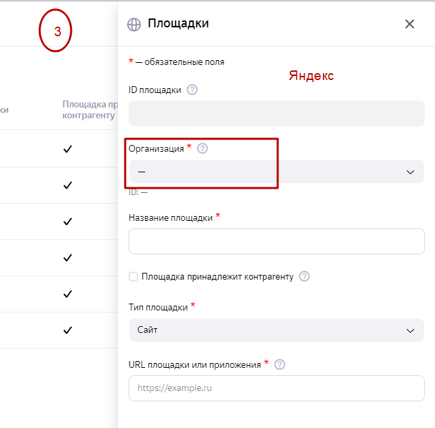 В ОРД Яндекс блок Площадки есть, но при занесении площадки необходимо указывать Организацию (слайд 3).