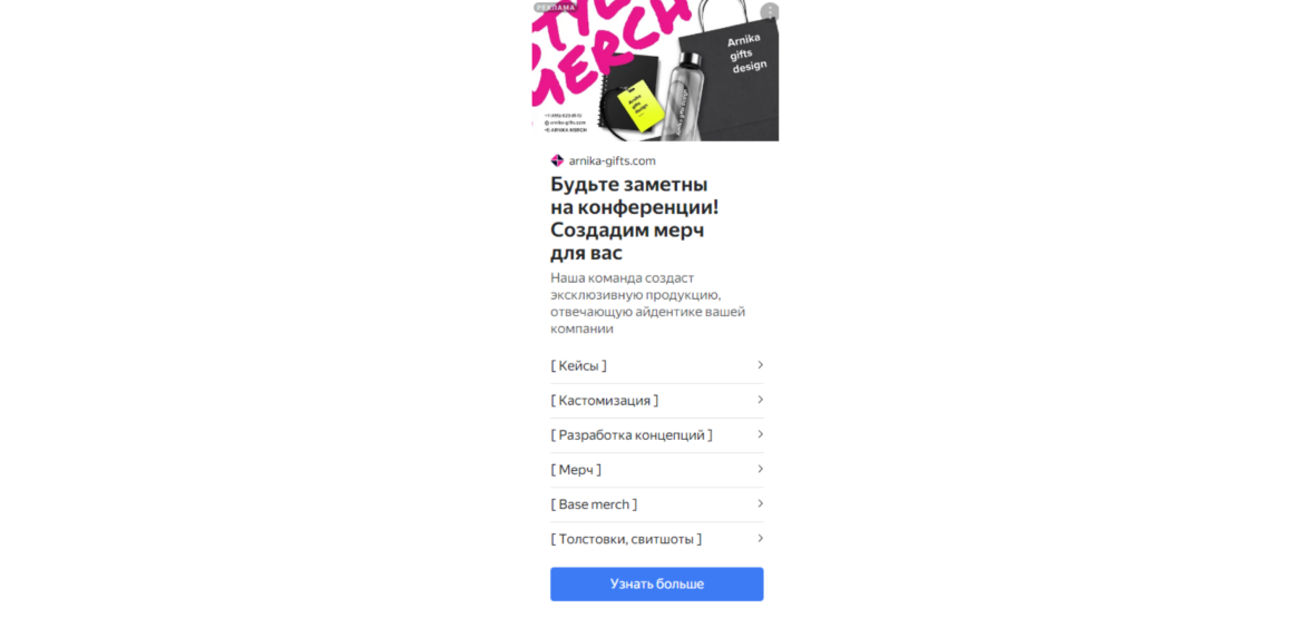 В РСЯ используем текстово-графические объявления и баннеры, которые нам предоставляет клиент. Креативы периодически меняем, чтобы пользователям они не приедались.