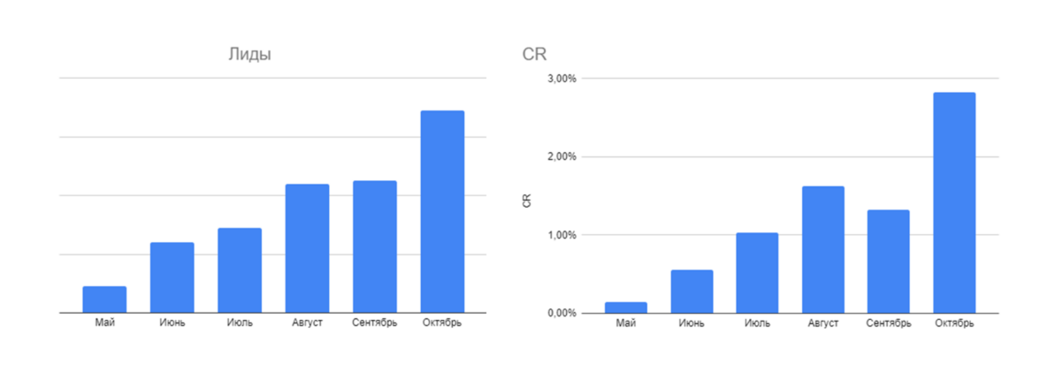 Мы увеличили количество целевых обращений, в том числе, за счет стабильного роста CR — отключали показы нецелевой аудитории, тестировали офферы и УТП, меняли креативы. Также выход новой версии сайта агентства летом заметно повлиял на рост заявок.