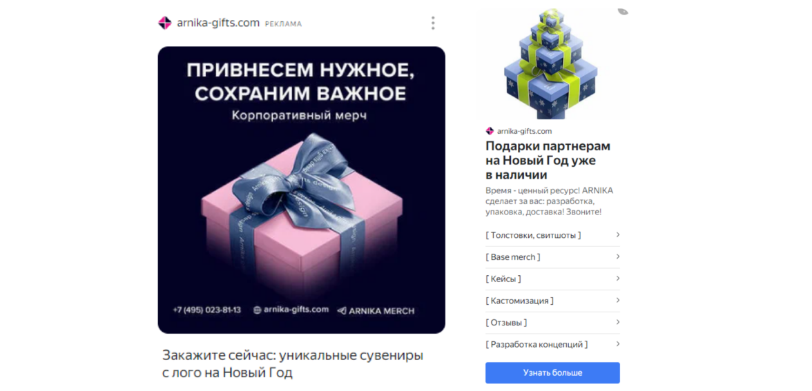 В РСЯ используем как графические, так и текстово-графические объявления с узнаваемыми образами подарков и Нового года.