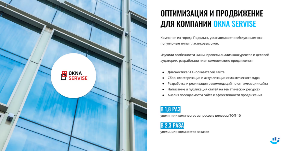 В условиях жесткой конкуренции в современном мире, эффективное применение цифровых инструментов и онлайн-рекламы становится ключом к успеху. Этот пример демонстрирует результаты нашего сотрудничества в области SEO с компанией OKNA SERVISE.