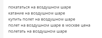Наш клиент предоставляет услуги в Москве, поэтому было важно исключить другие регионы: «абхазия», «адыгея», «астрахань» и так далее. Также мы убрали информационные запросы, которые вводят пользователи, например, для поиска обучающих материалов: «определение», «контрольная», «курсовая».