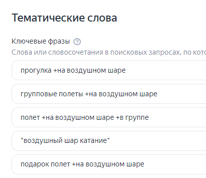 подбор ключевых слов: здесь мы использовали более широкие, чем на поиске, околотематические и высокочастотные запросы: «полет на шаре», «сертификат в подарок», «подарок девушке» и прочие. Система показывает рекламу на площадках, которые подходят под эти тематики: сайты с подарками, разными подарочными сертификатами, идеями для подарков и так далее;