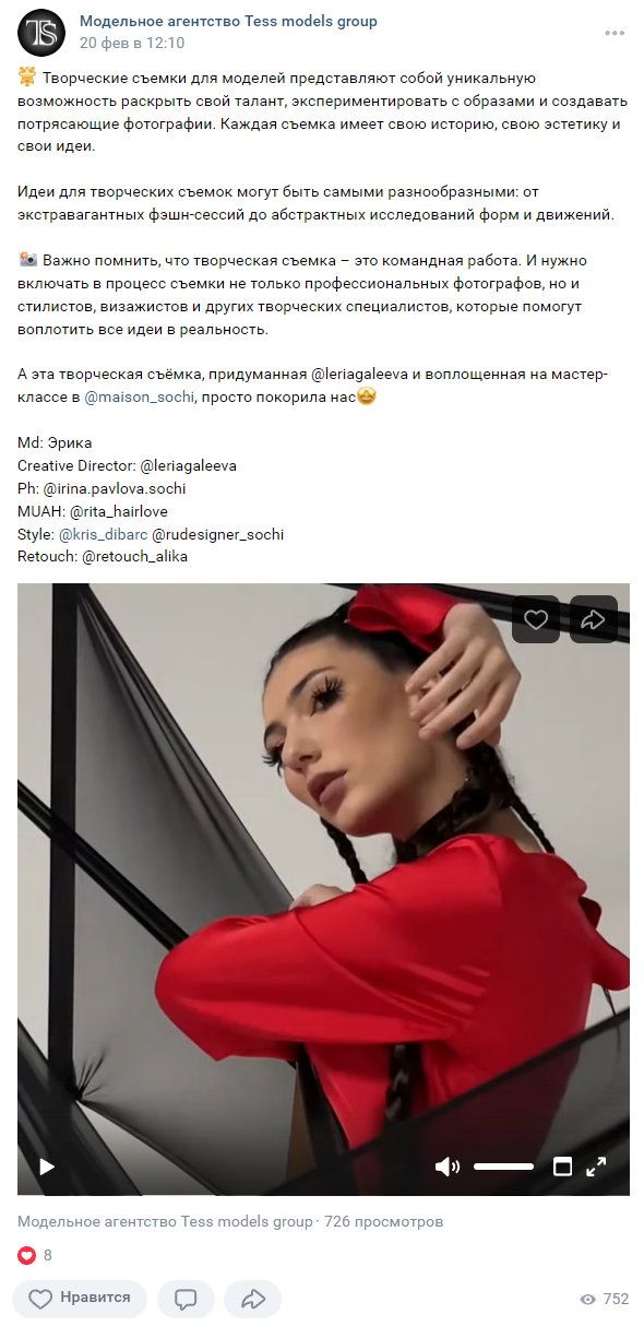 Показываем процесс съемок и раскрываем тему моделинга в постах и ВК клипах.