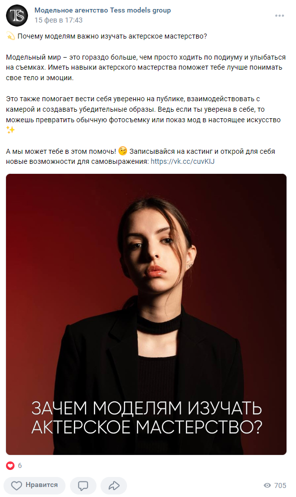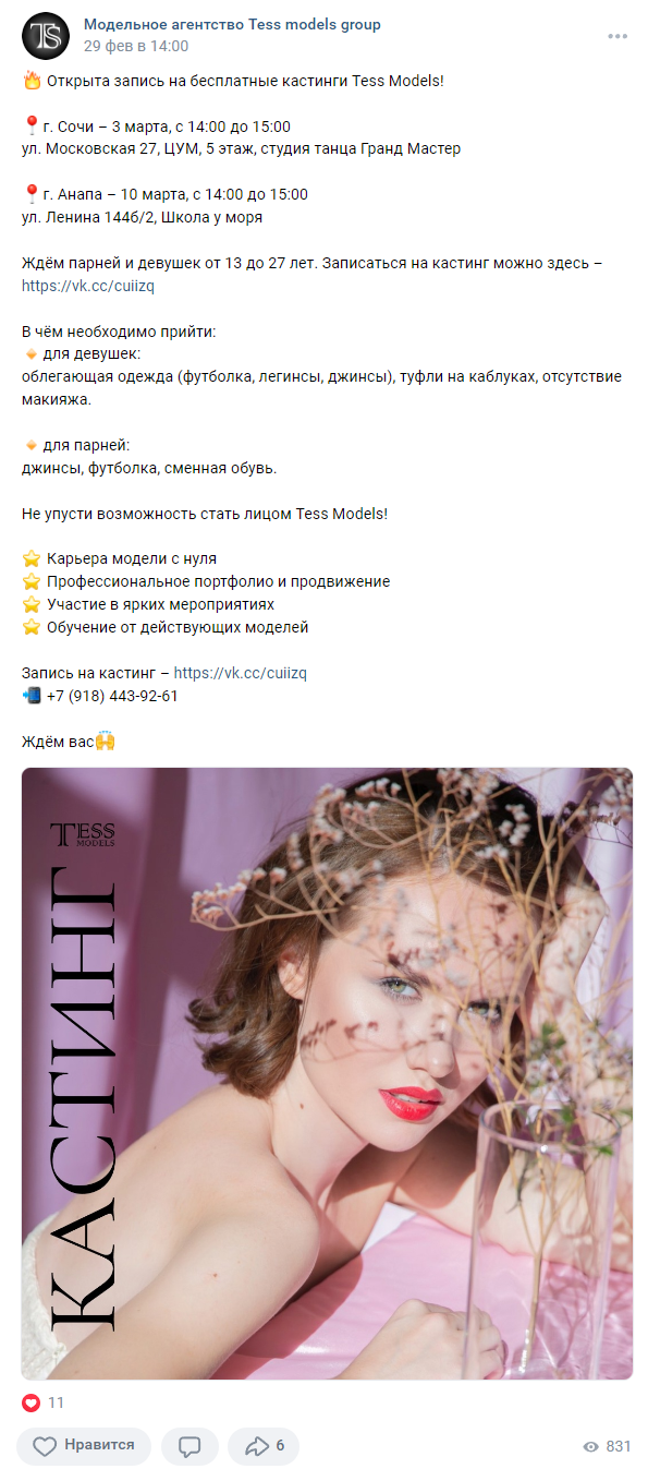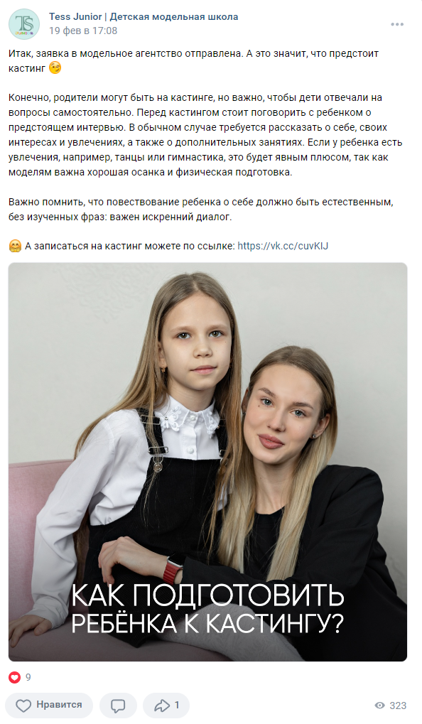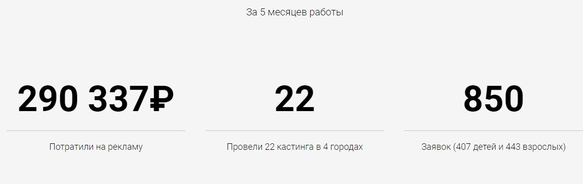 Клиент проводит кастинги детей и взрослых для дальнейших записей на полноценное обучение, поэтому нуждался в продвижении. Кастинг включал в себя показ умений кандидата — дефиле, актерское мастерство. Далее клиент закрывал на продажу обучения.