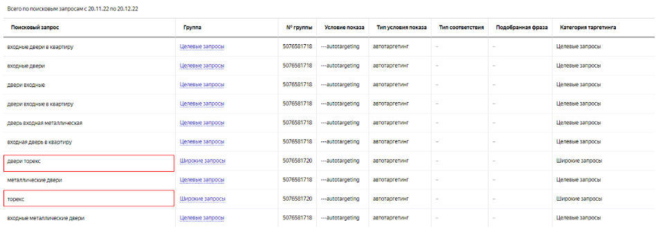 Пример некорректного использования минус-слов, в небрендовую кампанию попадают брендовые запросы.