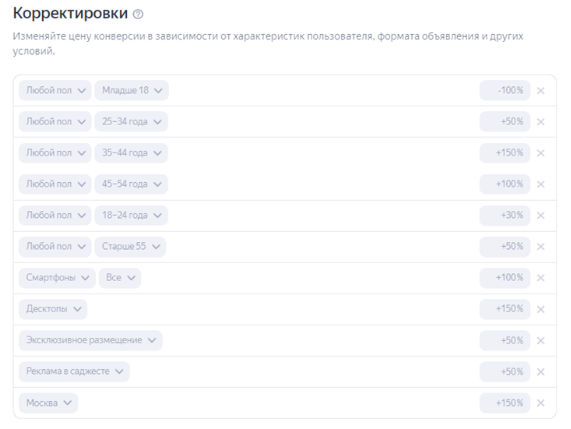 Пример корректировок, которые завышали стоимость конверсии в предыдущих кампаниях