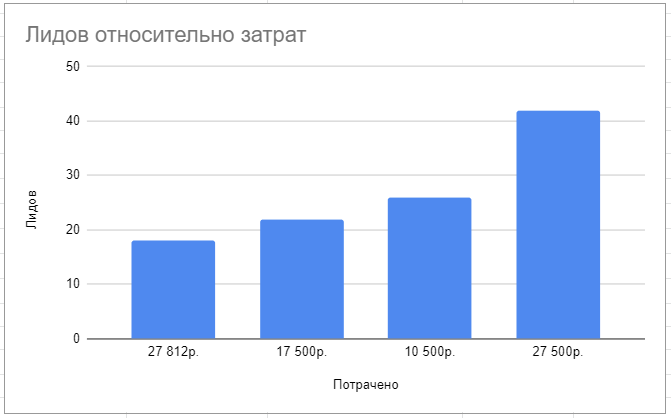 Из графика видно, что по мере роста канала снижается и стоимость 1 лида. Так, в первый месяц работы над каналом, стоимость лида составила 1545 руб., а к 4 месяцу это было уже 437 руб.
