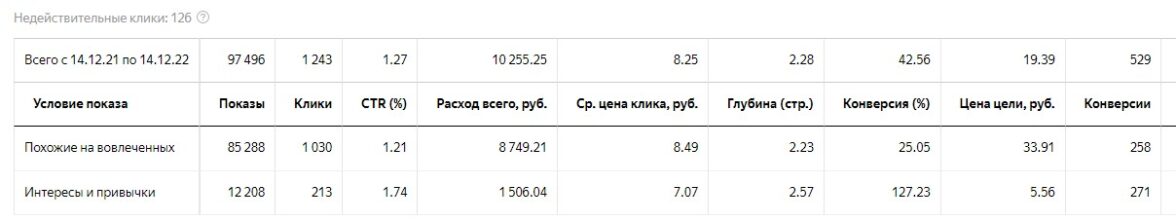 Баннеры были отрисованы, так что мы запустили также баннерную рекламу на пользователей, которые схожи с покупателями рекламируемого магазина, и по интересам. Так мы расширили воронку продаж. Посмотрим на статистику: