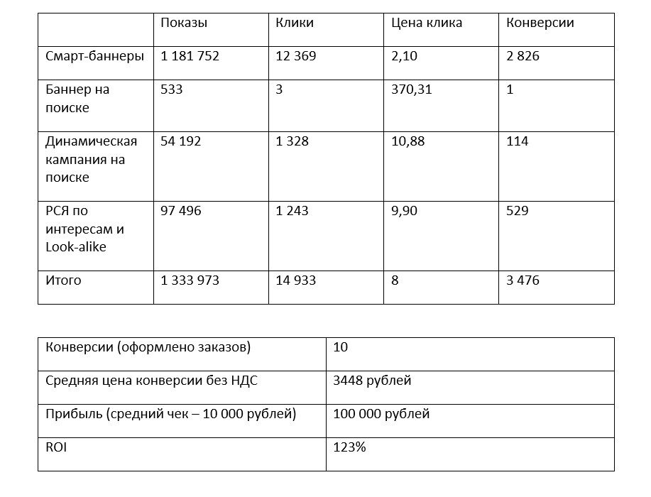 самой эффективной оказалась рекламная кампания со смарт-баннерами. Цена 1 клика — 2,1 рубля, такого результата в Яндексе мы не видели очень давно.