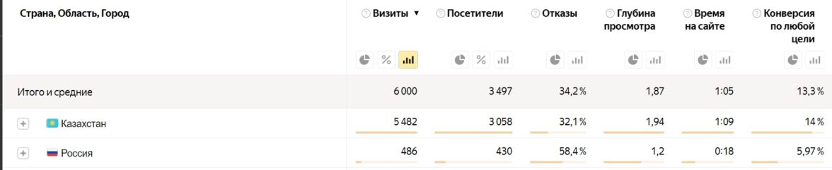 Посмотрим внимательно на полученные данные: показатели по России (конверсия, посещаемость, отказы) уступают показателям по Казахстану. Магазин нашего клиента, как и предполагалось, не выдержал российской конкуренции.