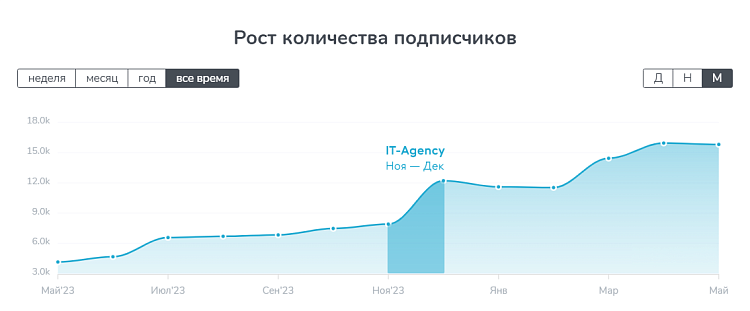 График показывает рост количества подписчиков в телеграм-канале клиента в период нашей работы