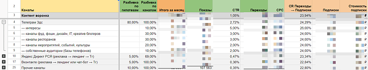 На скриншоте часть медиаплана, который мы показываем клиенту до начала работ. Мы строим прогнозы с количеством показов, суммами и обозначаем приоритетность каналов продвижения. Это позволяет на старте свериться с ожиданиями клиента и обозначить предстоящий пул работ со стоимостью