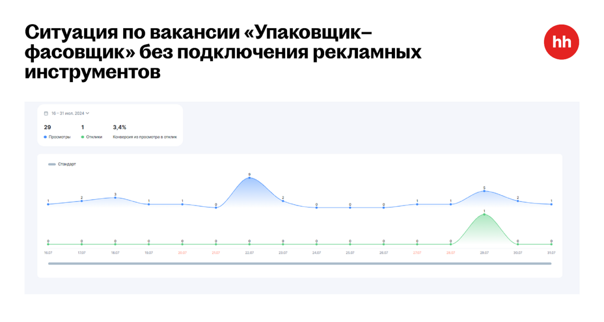Команда расширила воронку, подняла количество просмотров вакансий в 7 раз и увеличила число откликов пропорционально просмотрам. Например, объявление «Упаковщик-фасовщик» усилили Виртуальным рекрутером. Так получилось собрать 350 откликов за 1,5 месяца и превратить их в 12 трудоустроенных сотрудников.