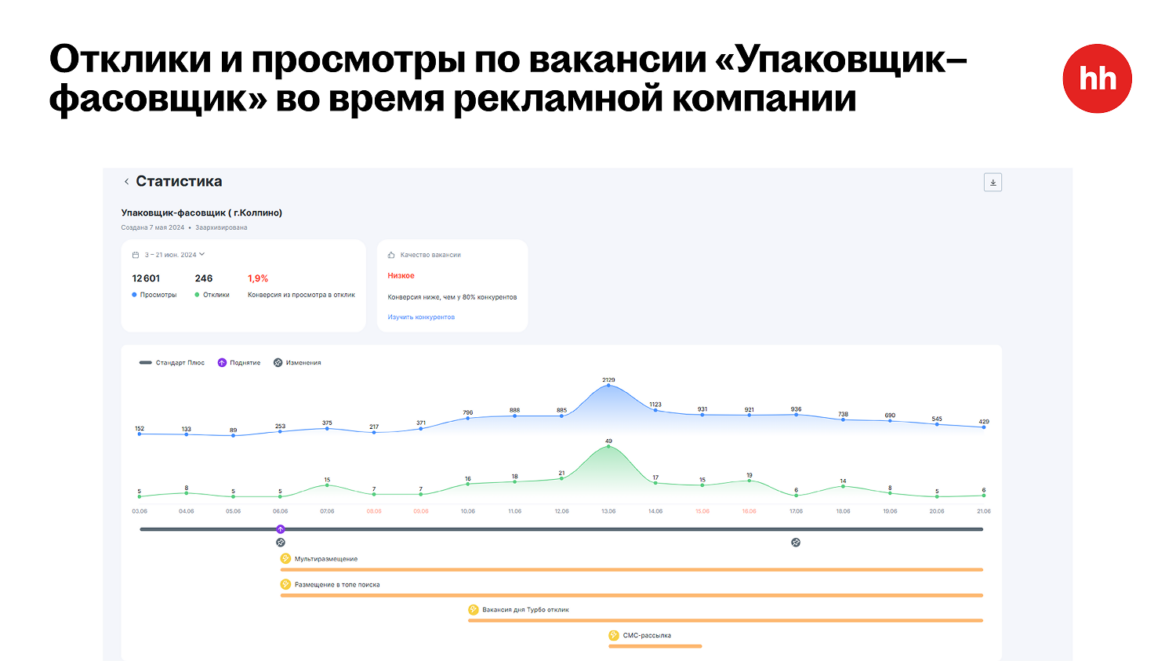 Я считаю, что нужно опираться на задачи, когда выбираешь инструменты продвижения. В моём случае нужен был комплексный подход, чтобы нанять около 100 сотрудников всего за 3 месяца. В других условиях можно выбрать, например, только смс-рассылки или размещение в топе поиска. Инструменты hh.ru помогают, если использовать их правильно. Мне нужно было попробовать и протестировать всё.