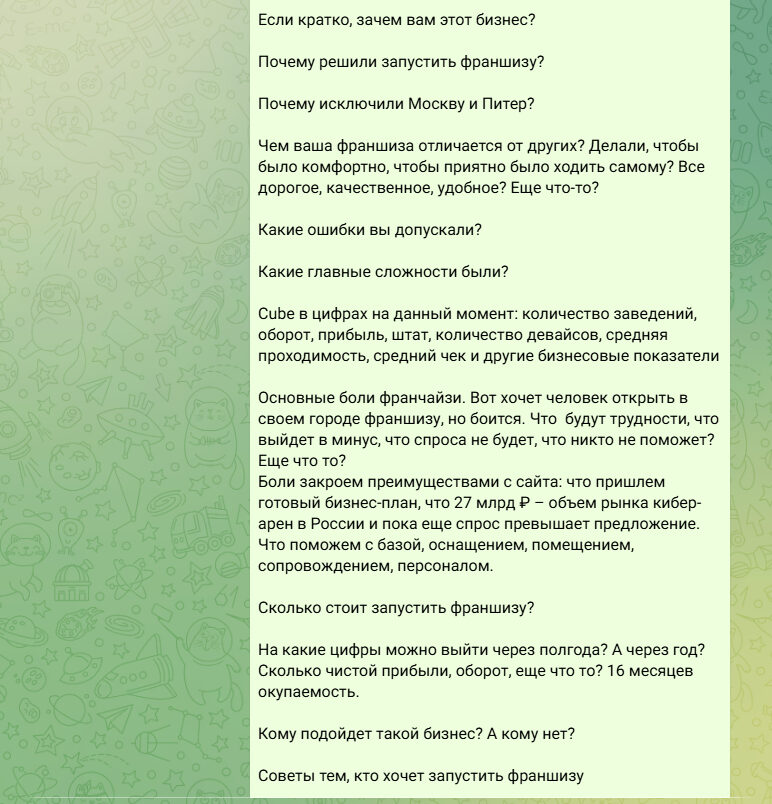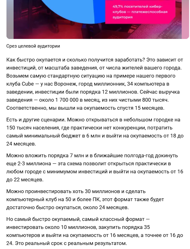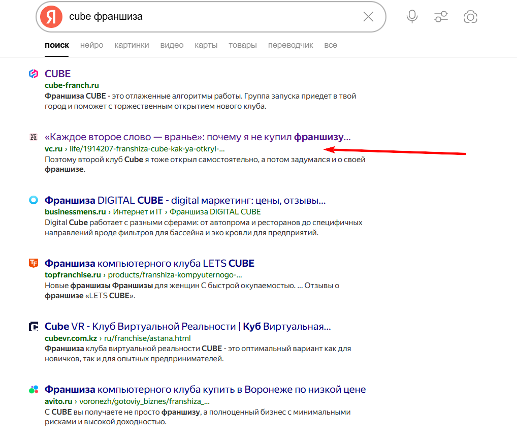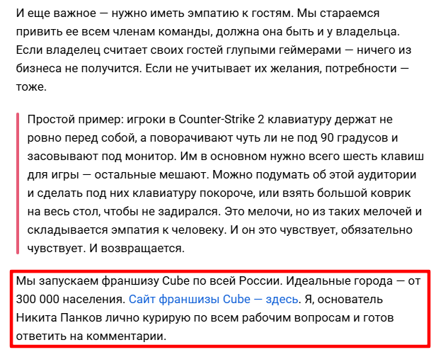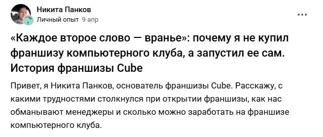Текст находится здесь: «Каждое второе слово — вранье»: почему я не купил франшизу компьютерного клуба, а запустил ее сам. История франшизы Cube.