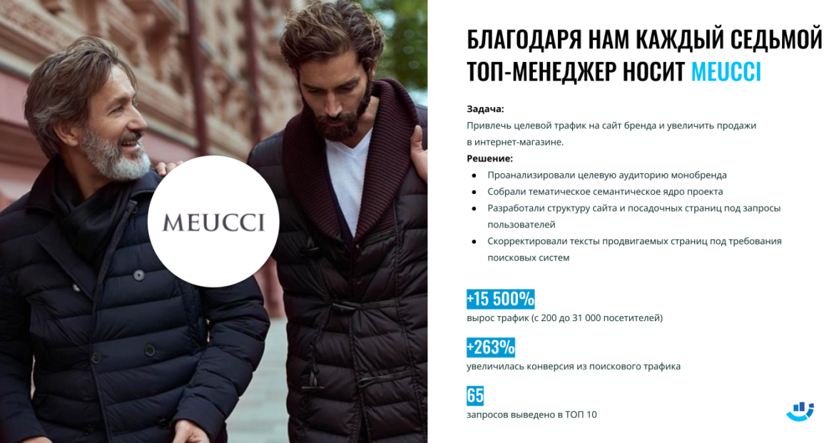 Стратегия: мы решили использовать комплексный подход к продвижению сайта Meucci. Основной акцент был сделан на поисковое продвижение, так как это один из самых эффективных способов привлечения целевой аудитории для интернет-магазинов.
