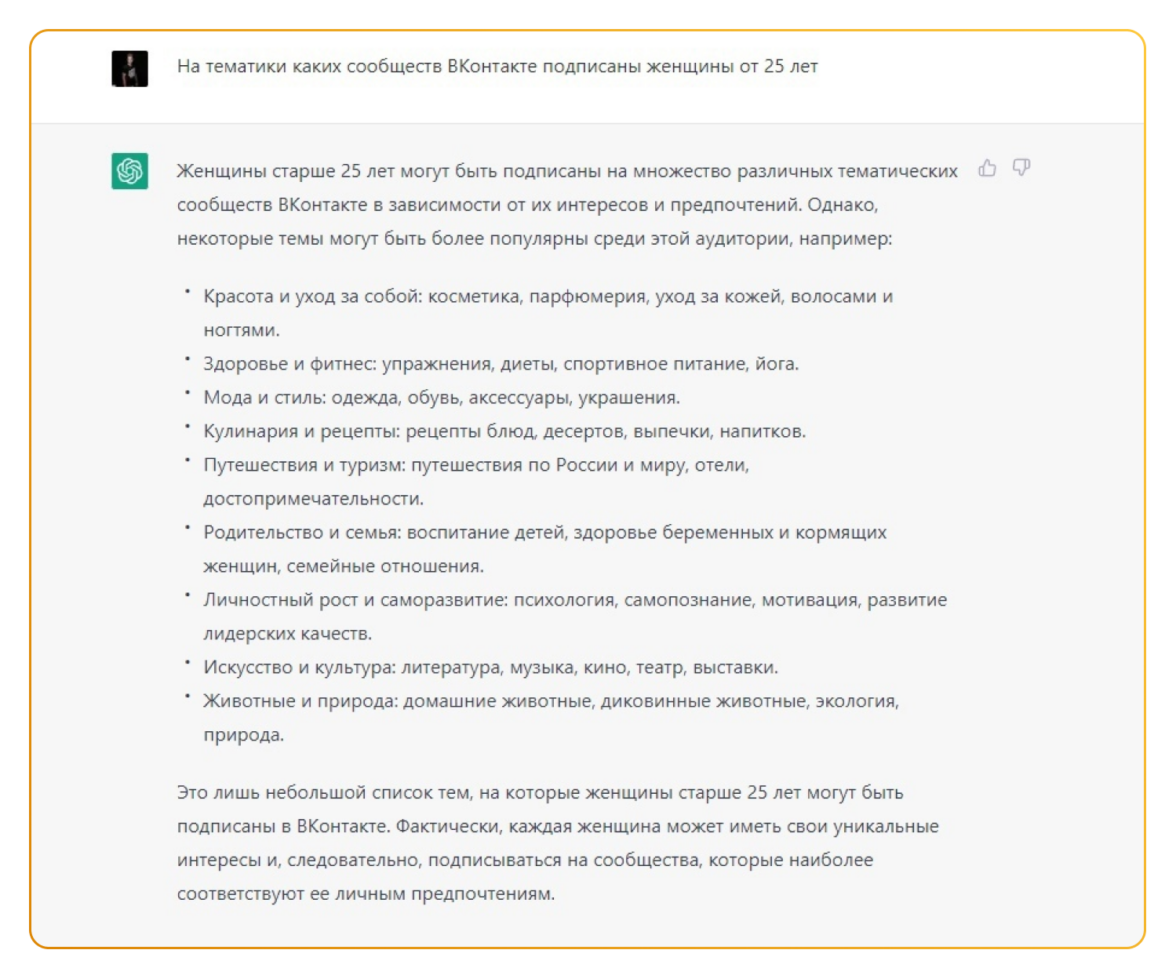 ИИ подсказал тематику пабликов, на которые может быть подписана наша целевая аудитория.