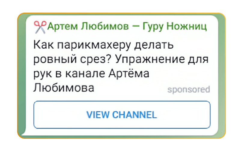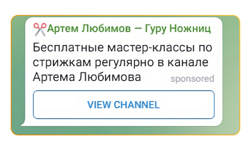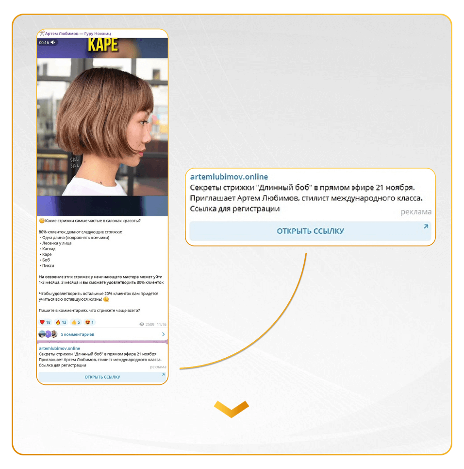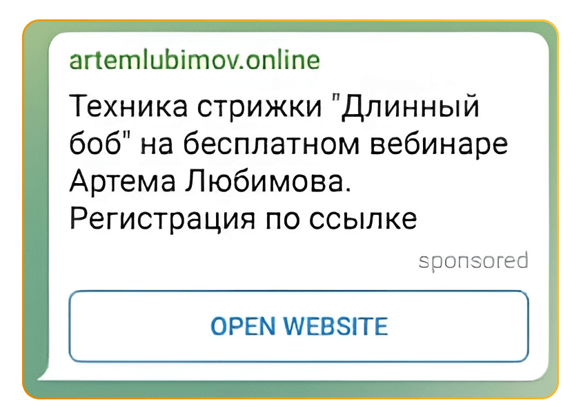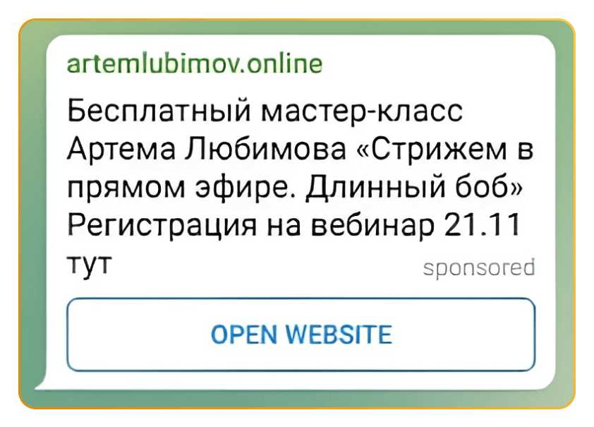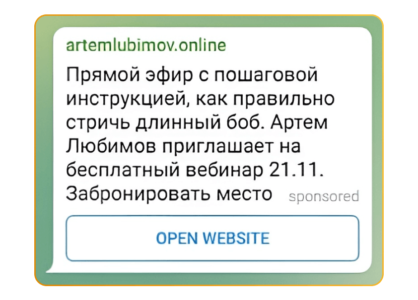 Вместе с заказчиком решили, что будем показывать нашей аудитории приглашение на вебинар, на котором наш специалист в прямом эфире выполняет стрижку. Подготовили тексты, запустили объявление в работу — и за 3 дня получили 32 регистрации по цене 79,66 рублей. Регистрации обошлись почти в 2 раза дешевле, чем при аналогичной рекламе ВКонтакте. Кроме того, нам удалось вытеснить конкурентов из телеграм-канала заказчика.