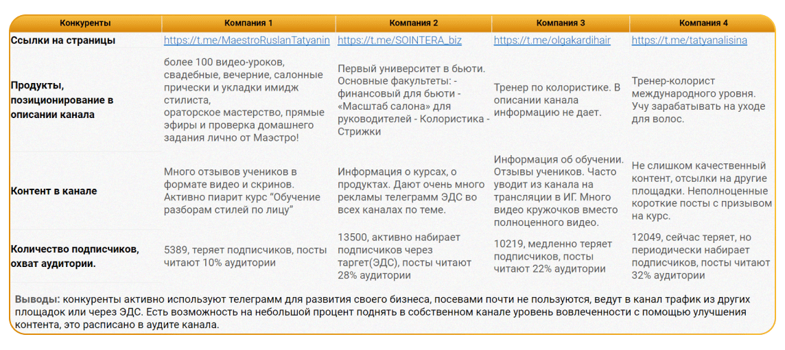 При анализе конкурентов мы сделали вывод, что ниша обучения парикмахерскому искусству широко представлена в Телеграме, поэтому конкурентов на этой площадке у заказчика довольно много.