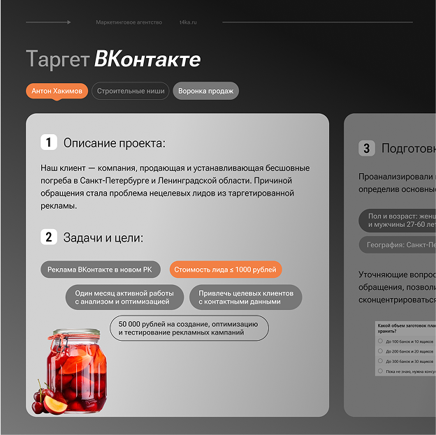В разгар строительного сезона к нам обратилась компания, устанавливающая бесшовные пластиковые погреба в Санкт-Петербурге и Ленинградской области. Их маркетолог поставил перед нами задачу — разработать эффективную воронку продаж через социальные сети, сосредоточив внимание на уникальных пластиковых погребах. Ранее они уже тестировали таргет ВК, но получали лишь поток нецелевых лидов.