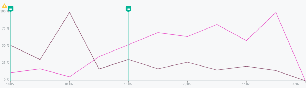 Заметно, как увеличивается количество лидов периодически (розовая линия) и как снижается CPL (бордовая линия).