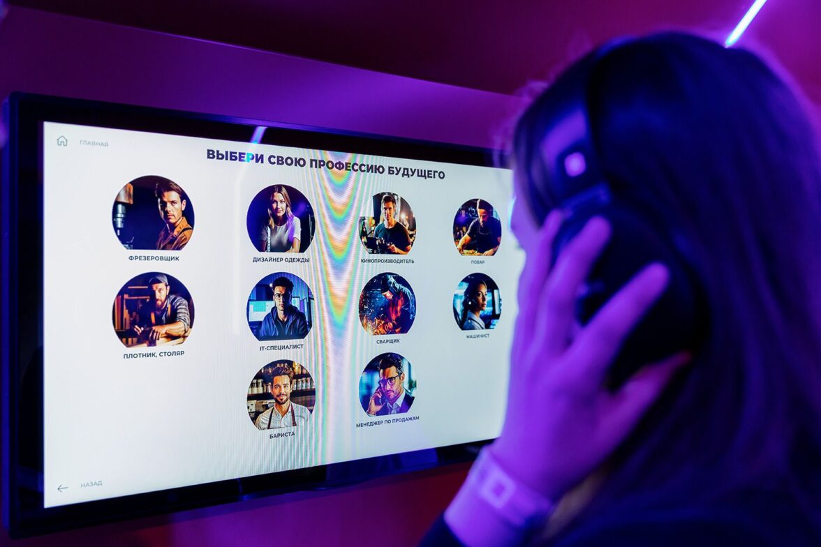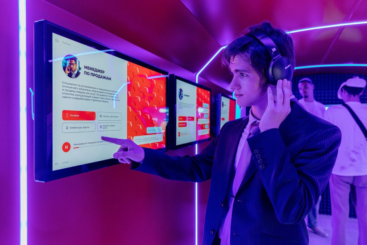 В «Профитраке» можно познакомиться с десятью востребованными специальностями — от бариста и сантехника до дизайнера одежды и сварщика. Уникальность подхода заключалась в многоуровневом погружении: примерить профессию можно через VR-симуляторы, где гости варят виртуальные швы на корабле или готовят капучино, и через звуковое взаимодействие, надев наушники и воспользовавшись тач-панелями уникального диджей-экспириенса «В ритме профессий».