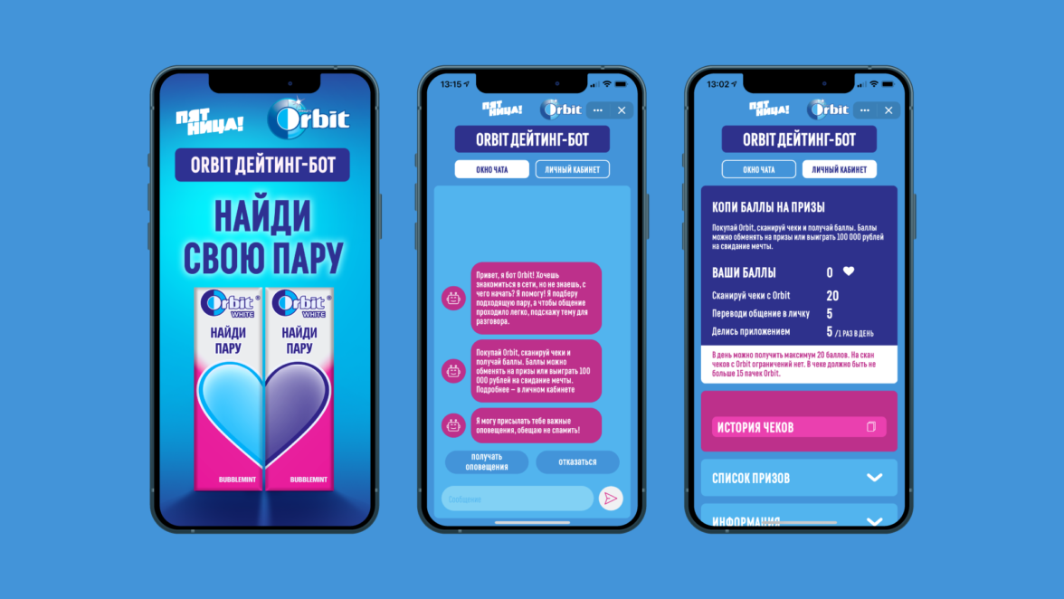Идея построить коммуникацию бренда Orbit с аудиторией на территории знакомств была предложена компанией Mars. Вдохновившись концепцией, digital команда «Пятницы!» вместе с агентством MediaCom разработали дейтинг-бот на базе VK Mini Apps.