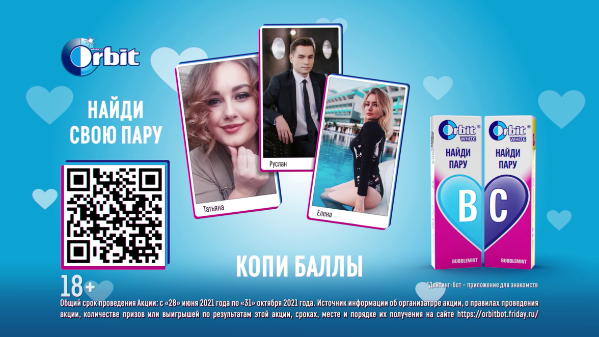 С помощью акции «Найди свою пару» планировалось повысить релевантность бренда жевательной резинки Orbit на территории свиданий. В основе этой рекламной кампании лежит идея о том, что людям достаточно сложно знакомиться онлайн из-за страха быть непонятыми или показаться неинтересными.