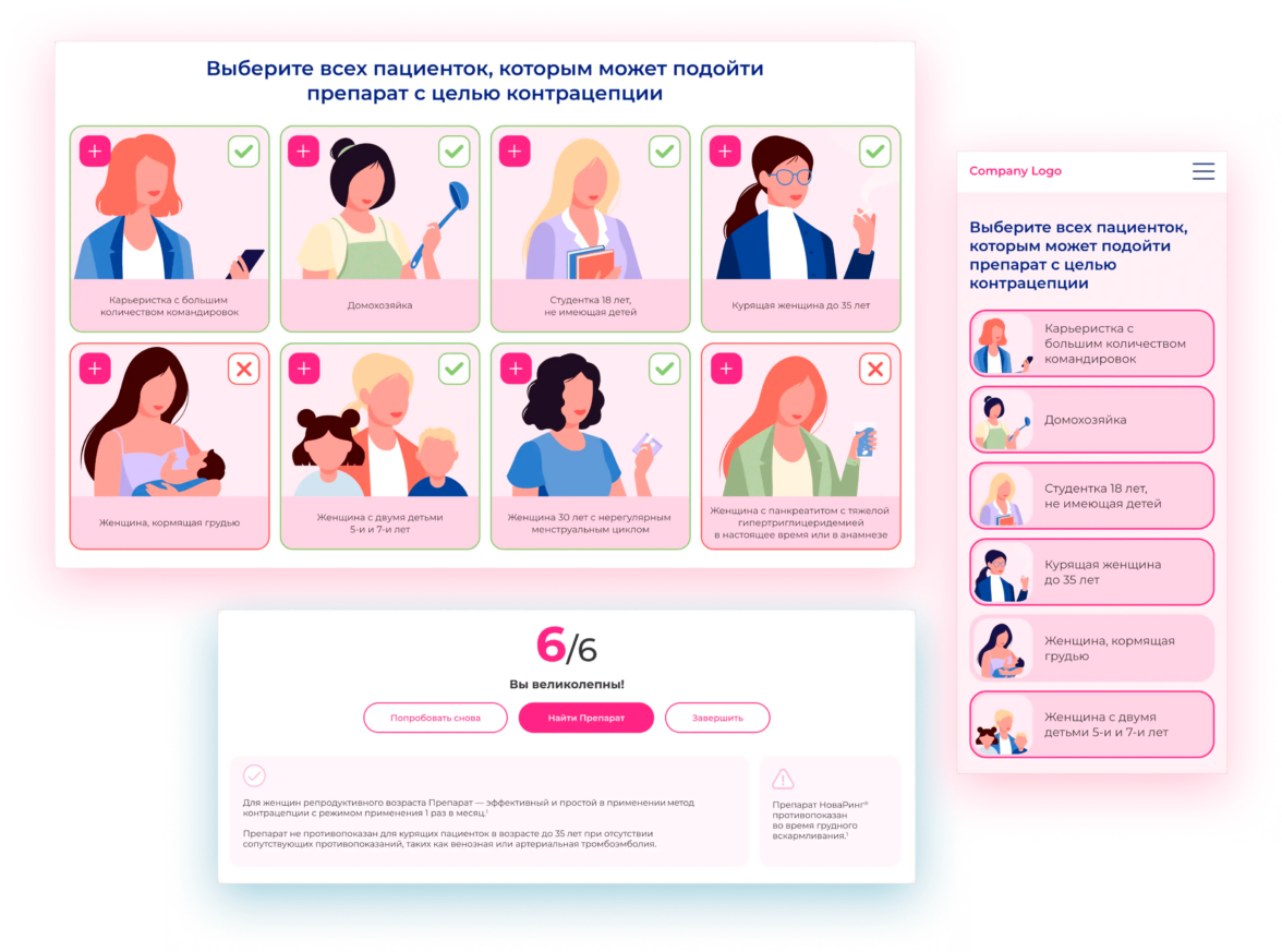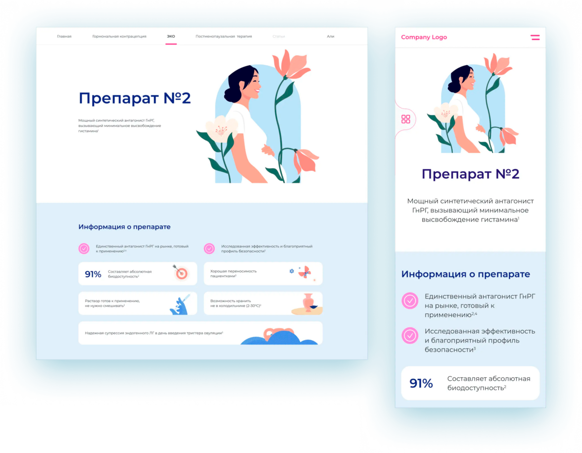 Перед нами стояла задача разработать многостраничный сайт для портфеля препаратов женского здоровья (гормональная контрацепция, ЭКО, постменопаузальная терапия), представить широкий выбор брендов, покрывающий потребности любой категории пациенток, рассказать об особенностях и преимуществах каждого препарата.