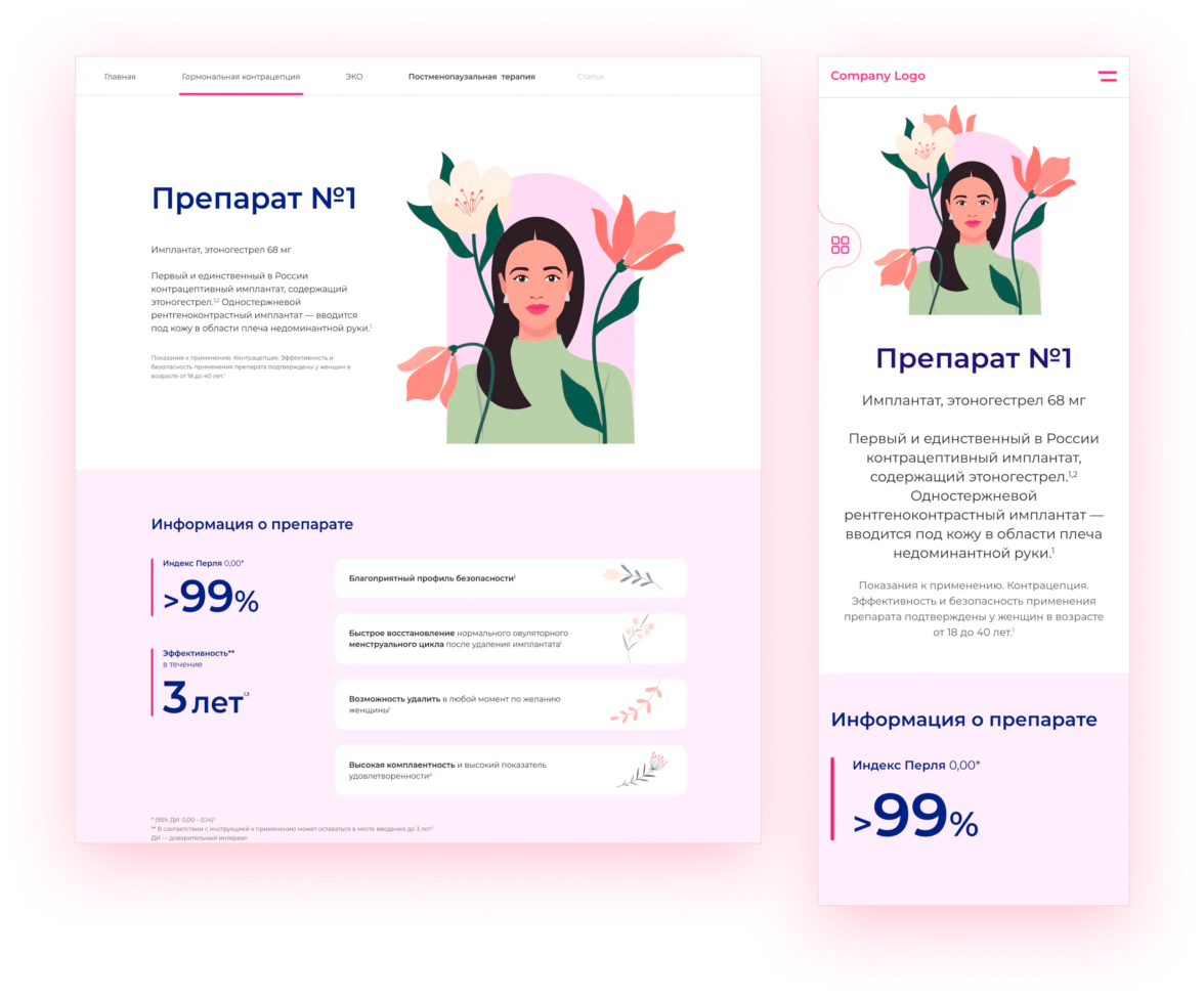 Разработанная дизайн-концепция выполнена с использованием основных элементов и цветовой палитры бренд-бука Компании, что поддерживает преемственность и узнаваемость, но благодаря кастомным иллюстрациям и дополнительной интеграции брендовых цветов создается уникальный узнаваемый образ для каждого препарата в отдельности. Основная тема женского здоровья поддерживается «воздушными» иллюстративными образами и нежной цветовой палитрой.
