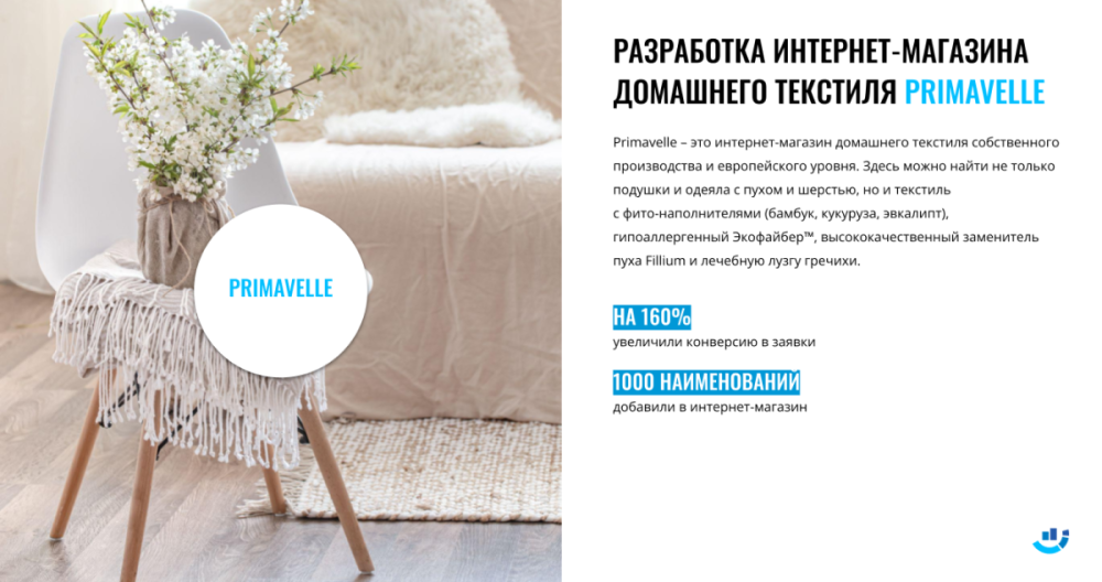 Клиент. Primavelle — это веб-магазин высококачественного текстиля. Ассортимент включает подушки, одеяла, а также уникальные текстильные изделия с различными наполнителями, от экологичного до гипоаллергенного.