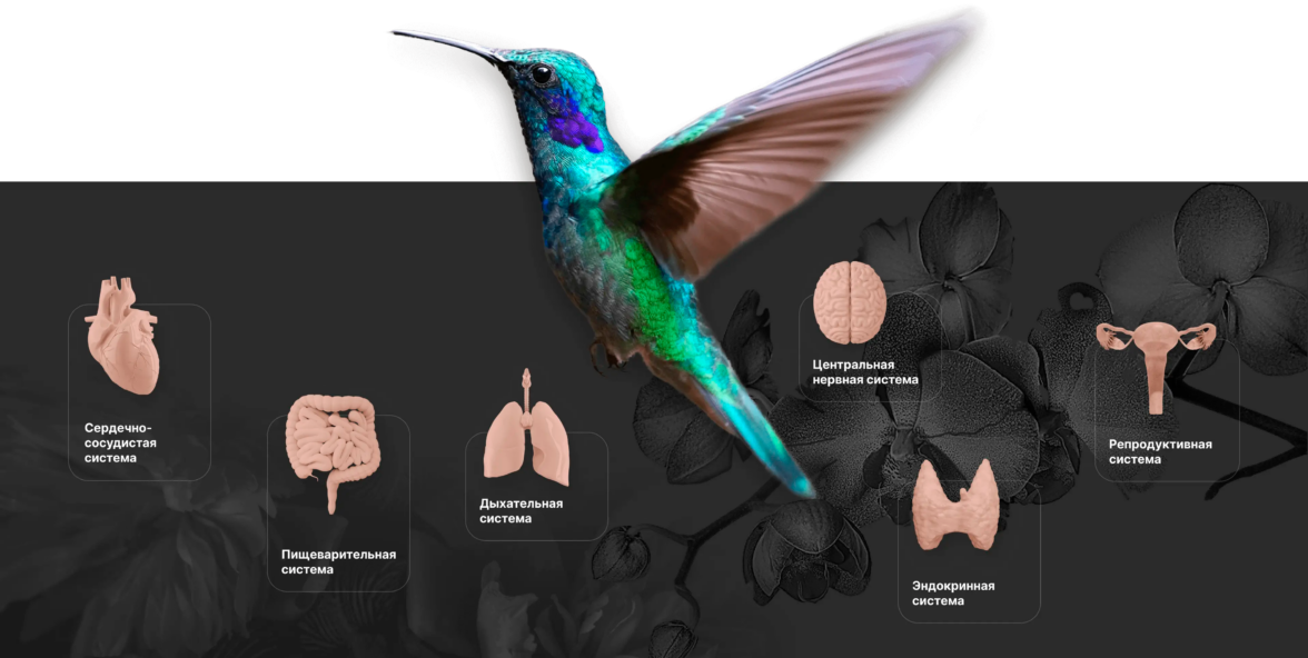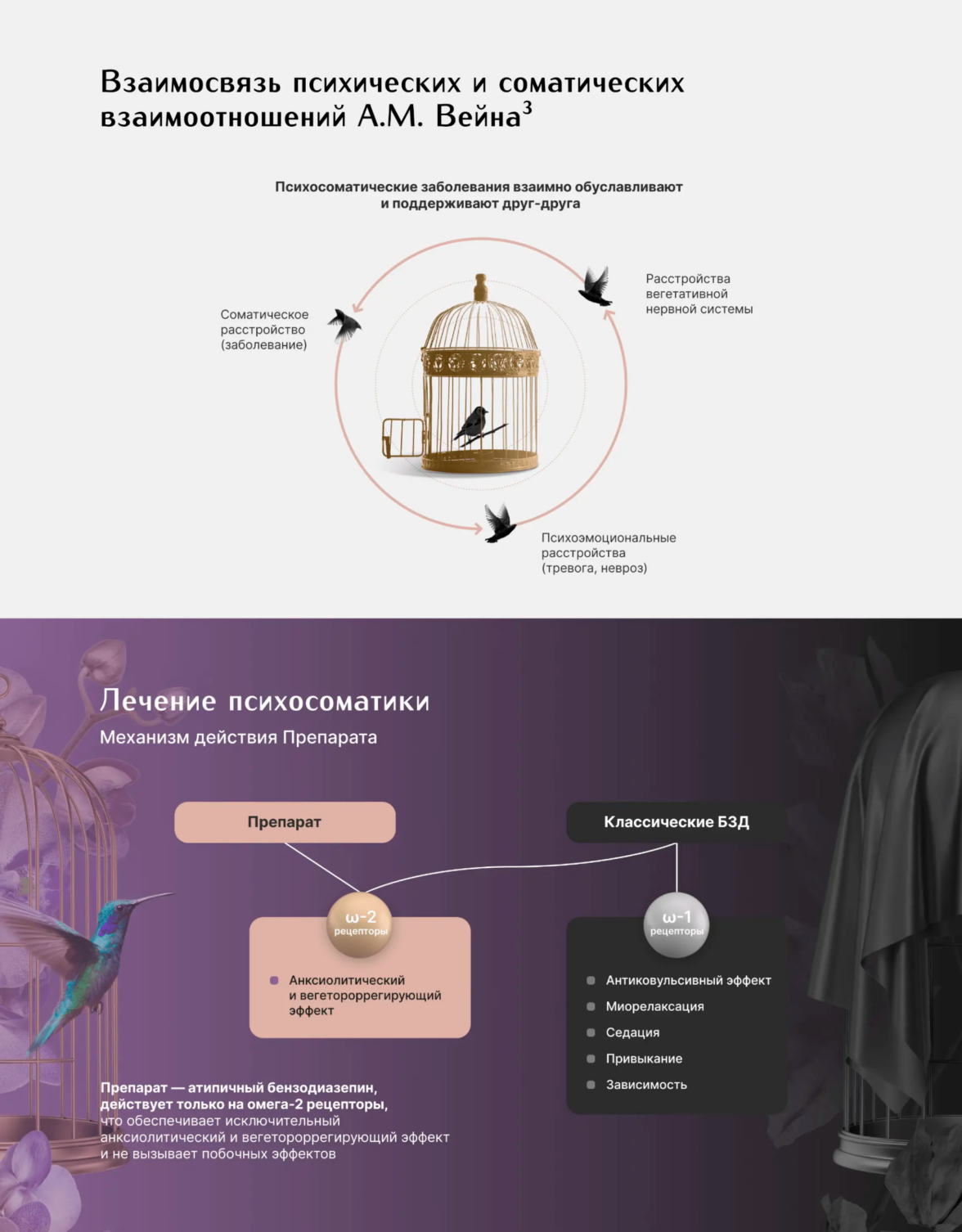 В рамках проекта был разработан медицинский контент для наполнения страницы. В основе концепции сайта метафоричный образ увядающего цветка и птицы, бьющейся в клетке, символизирующие пациента, который находится в состоянии тревоги, не может жить гармонично и свободно.