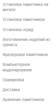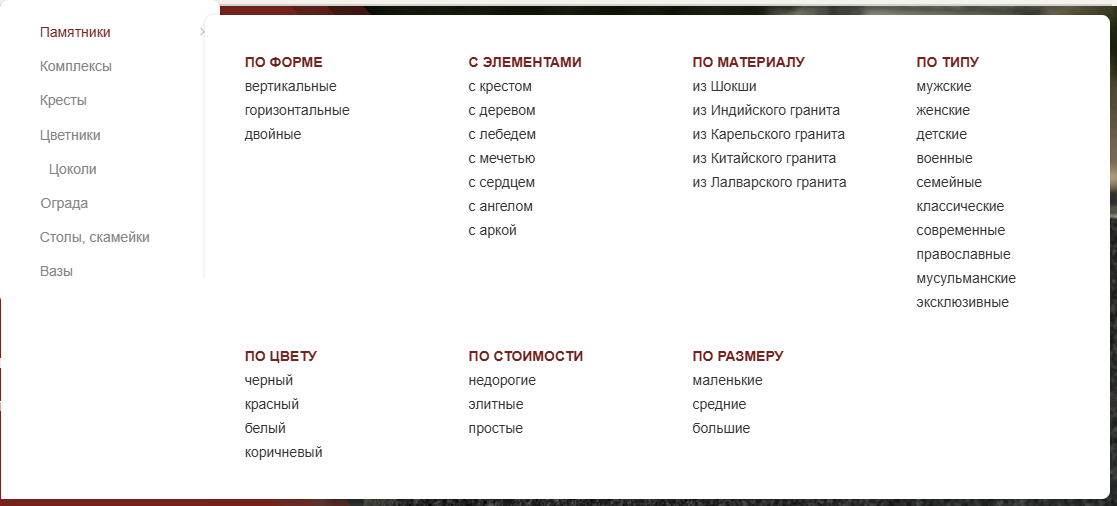 По типам изделий: «памятники с ангелом», «двойной памятник из гранита», «памятник с крестом», «мусульманские памятники», «стела на могилу».По материалам: «памятник из карельского гранита», «памятники из Шокши».