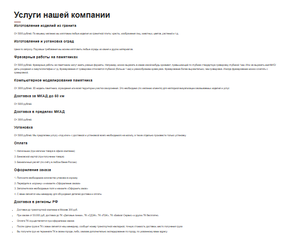Например, вместо обобщённых «Каталог памятников» или «Продукция» — «Двойные памятники из гранита», «Памятники из лалварского гранита», и так далее.