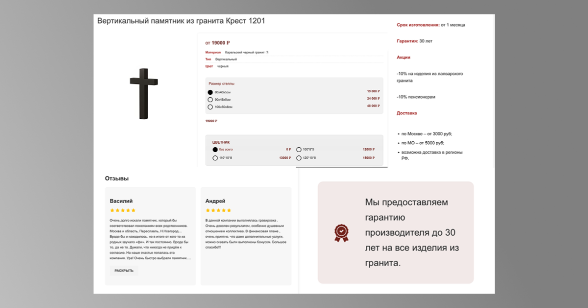 Ритуальные услуги — одна из самых специфичных и конкурентных в SEO. Основной товар — изделия из гранита: памятники, ограды и элементы оформления. Это дорогостоящая покупка, которую не совершают спонтанно.