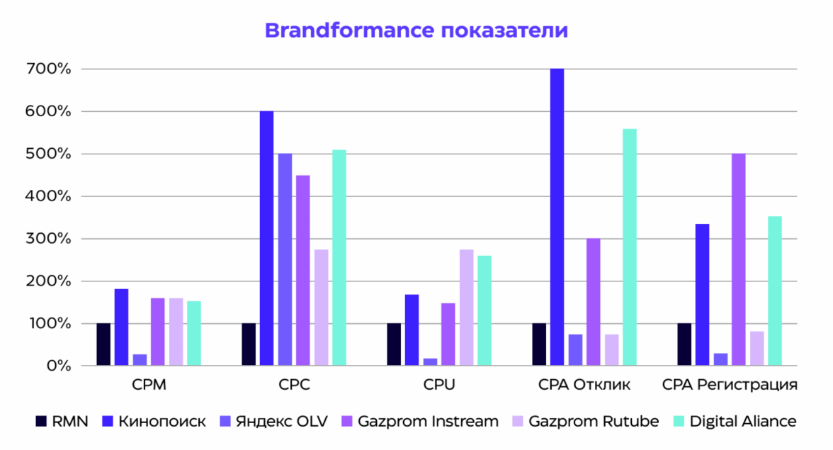 В лидерах по количеству откликов на вложенный рубль. При одинаковом бюджете, RMN привёл в 3 раза больше откликов, чем Gazprom Instream, и почти в 6 раз больше, чем Digital Alliance.