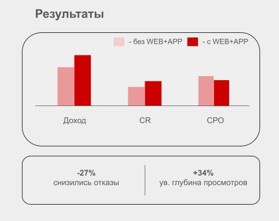 Еще один плюс — использование сценария Web+App принесло дополнительный объем данных для обучения рекламных кампаний. Смогли получить 41% дополнительного дохода.