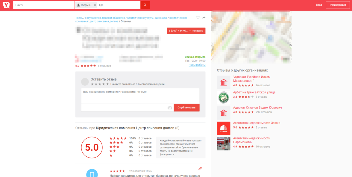 Кроме того, с целью повышения узнаваемости бренда мы зарегистрировали организацию на внешних площадках по согласованному перечню. Туда вошли платформы gdeyurist.ru, zoon.ru, otzywy.com, jsprav.ru, firmap.ru и другое. Поскольку поисковики при ранжировании мониторят присутствие компаний в Сети, прием хорошо работает на повышение позиций карточек в ЯК.