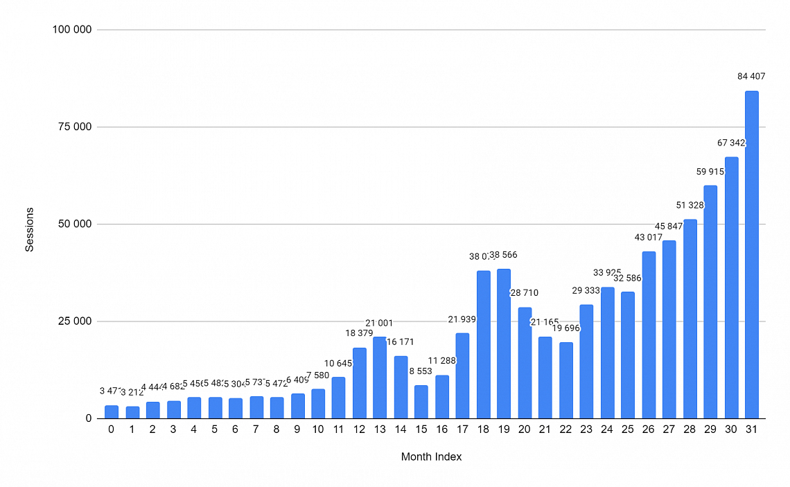 В 2021 году вырос объём поискового трафика в блоге — количество сессий увеличилось с 3 500 до 84 400