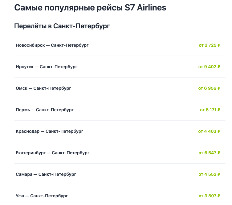 На страницы рейсов мы добавили ссылки на страницы направлений, чтобы вписать их в общую структуру сайта. Например, на странице рейса S7–1005 мы добавили блок с популярными направлениями полётов из разных городов в Санкт-Петербург.