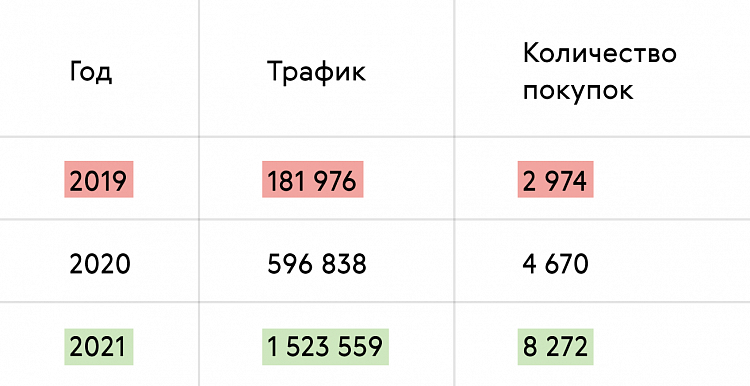 количество трафика на сайте s7.ru увеличилось с 182 тысяч в 2019 году до 1,5 млн в 2021 году;