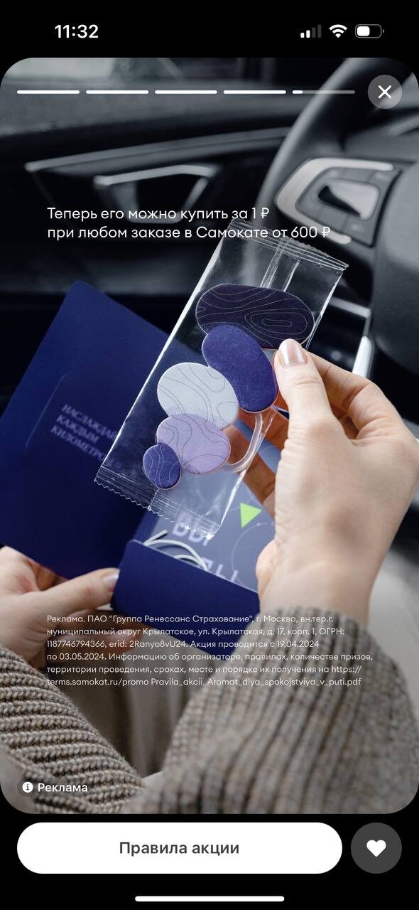 Автопарфюм можно было получить всего за 1 руб. при любом заказе в «Самокате» на сумму от 600 руб. Благодаря этой механике о кампании узнала большая часть аудитории пользователей сервиса. Так, аромат оказался в тысячах автомобилей, а бренд — в радиусе интересов водителей.