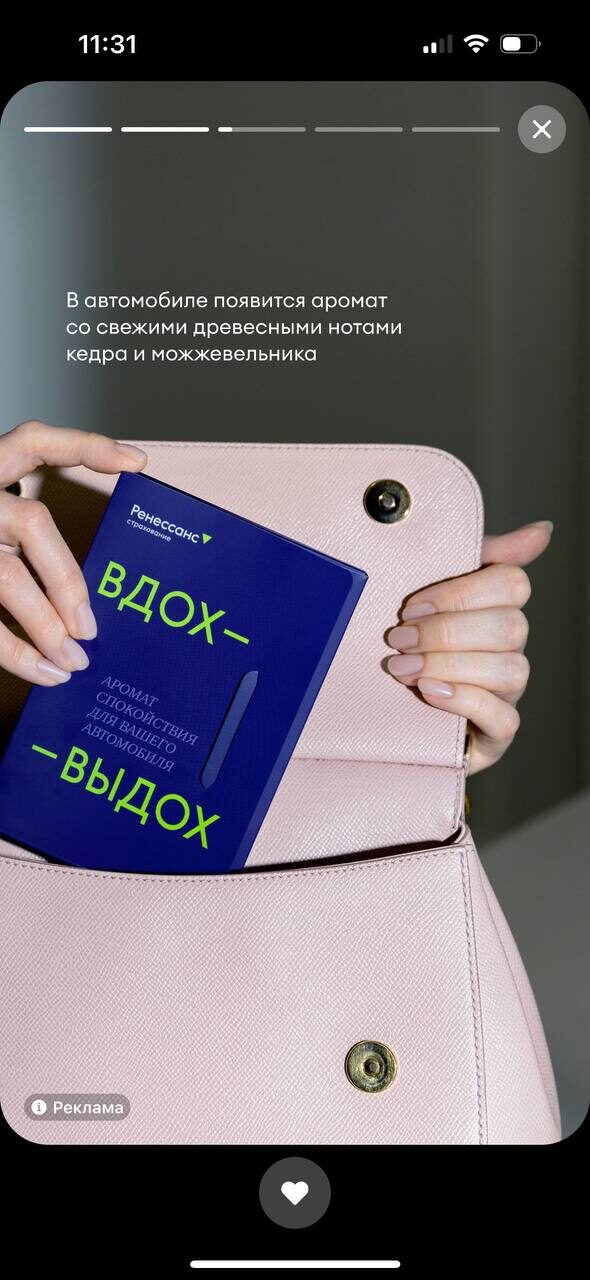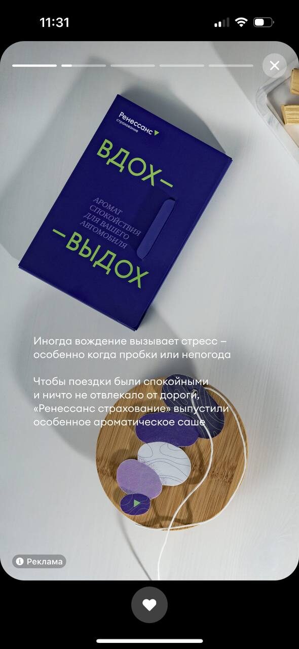 К запуску кампании «Ренессанс страхование» выпустил брендированный ароматизатор для автомобилей с расслабляющими древесными хвойными нотами. Саше можно было повесить на зеркало машины, чтобы хвойный аромат распространился по всему салону.