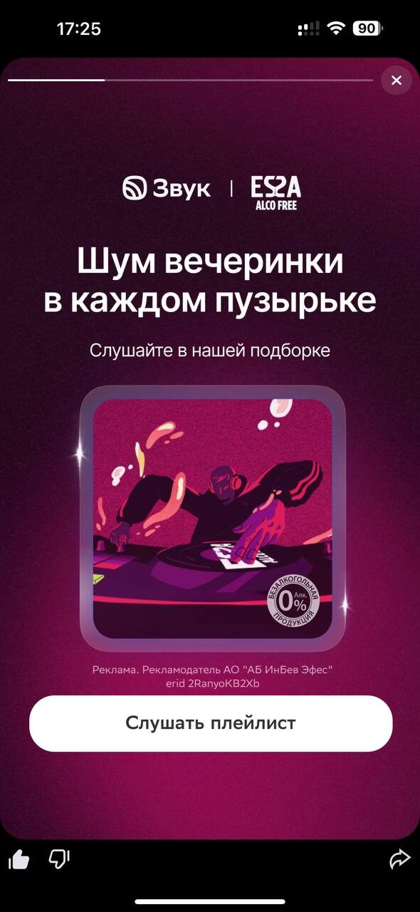 При входе в сервис Звук пользователи видели сторис с логотипом ESSA 0.0 и с предложением послушать плейлист. Все работало на прямое позиционирование продукта — яркого премиального бренда со стильной упаковкой и необычными вкусовыми сочетаниями.