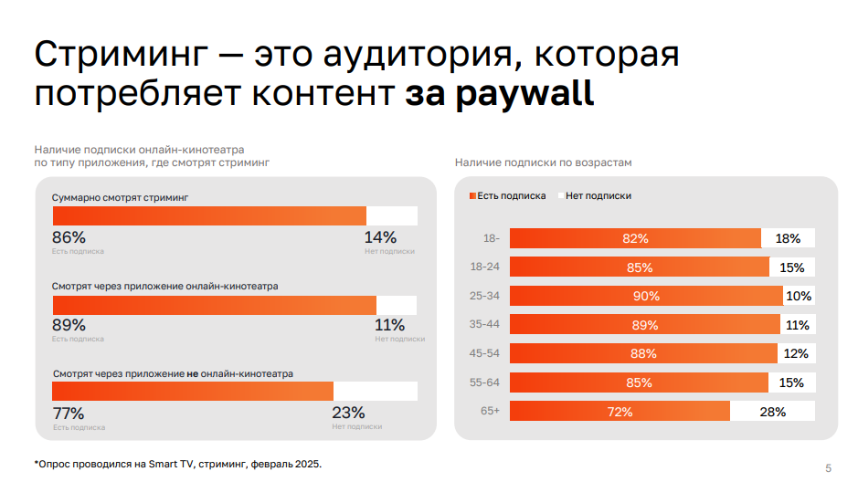 Помимо дохода важно было подтвердить основной паттерн потребления стриминга. С помощью опроса в Смарт ТВ, команда проекта выяснила, что основа аудитории стриминга, это люди, которые платят за подписку.