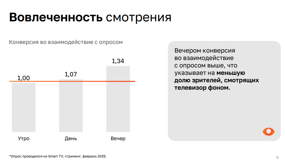 Если говорить о внимании пользователя, то мы видим, что по вечерам эта труднодоступная аудитория стриминга смотрит контент более вовлечено и реагирует на коммуникацию. Как и в традиционном ТВ, это и есть тот самый прайм-тайм, который стоит использовать для повышения эффективности размещения в лицензионной видео-рекламе в интернете. Со своей стороны, для усиления коммуникации с пользователем мы предлагаем специальные предложения для размещения в прайм-тайм.
