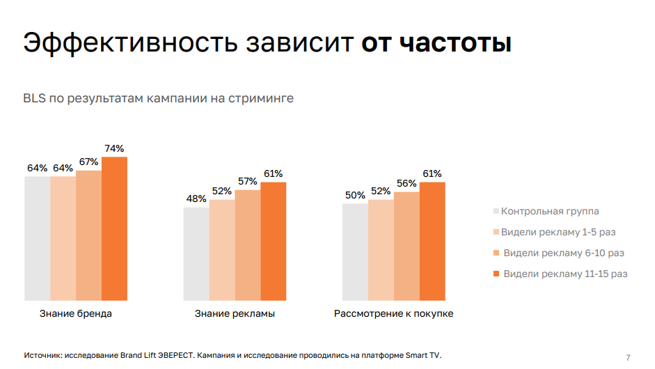 В конце прошлого года команда ЭВЕРЕСТ также проводила bls-исследование, в котором стало ясно, что покупка стриминга по традиционным диджитал-правилам с частотой 3−5 не позволяет добиться какого-то значимого эффекта для бизнеса. В ТВ эффект от рекламной кампании заметнее и происходит быстрее. Это именно тот нюанс, который необходимо учитывать рекламодателям при планировании рекламной кампании с использованием инвентаря стриминга. А именно отходить от логики традиционных подходов с частотами 3–5 в сторону частот от 10 и выше.